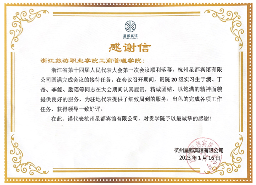 今日,学院收到杭州星都宾馆寄来的感谢信,对我院20级实习生于澳、丁奇、李能、励瑶就浙江省第十四届人民代表大会期间的优秀表现予以高度赞扬。