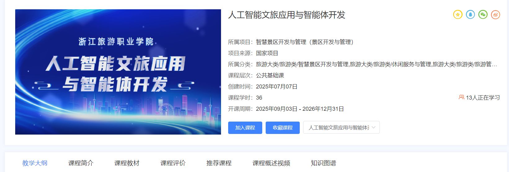 在国家大力推进数字经济与实体经济深度融合,文旅产业亟待智能化升级的背景下,由浙江旅游职业学院数字技术应用学院倾力打造的《人工智能文旅应用与智能体开发》课程,近日已完成一期建设,并在智慧景区开发与管理专业国家级教学资源库官网上线发布。该课程的上线,充分展现了数字技术应用学院在“人工智能+文旅”交叉学科建设方面的领先实力,也标志着学院在推动教育数字化转型与学科融合方面迈出坚实一步。
